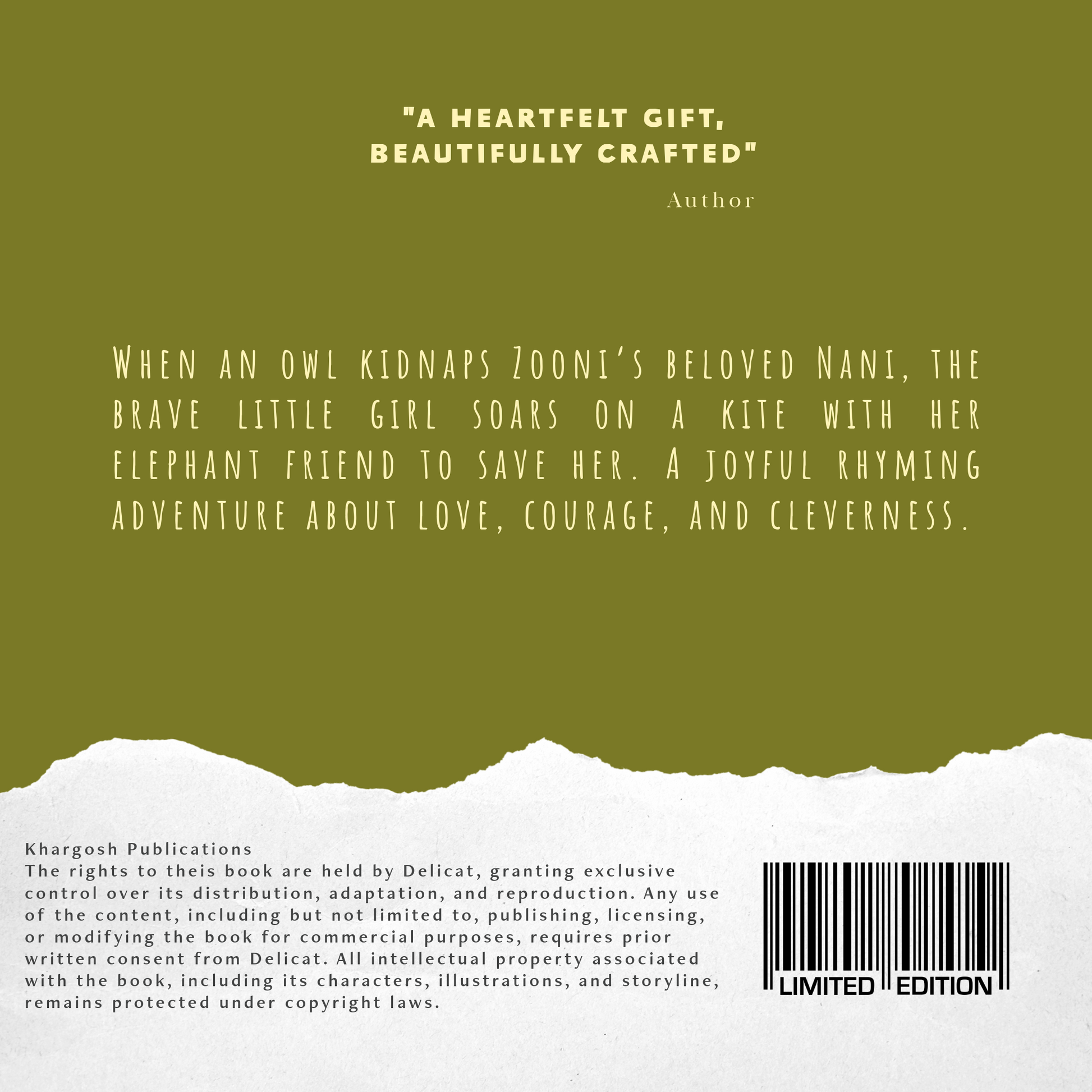 When an owl kidnaps Zooni’s beloved Nani, the brave little girl soars on a kite with her elephant friend to save her. A joyful rhyming adventure about love, courage, and cleverness.