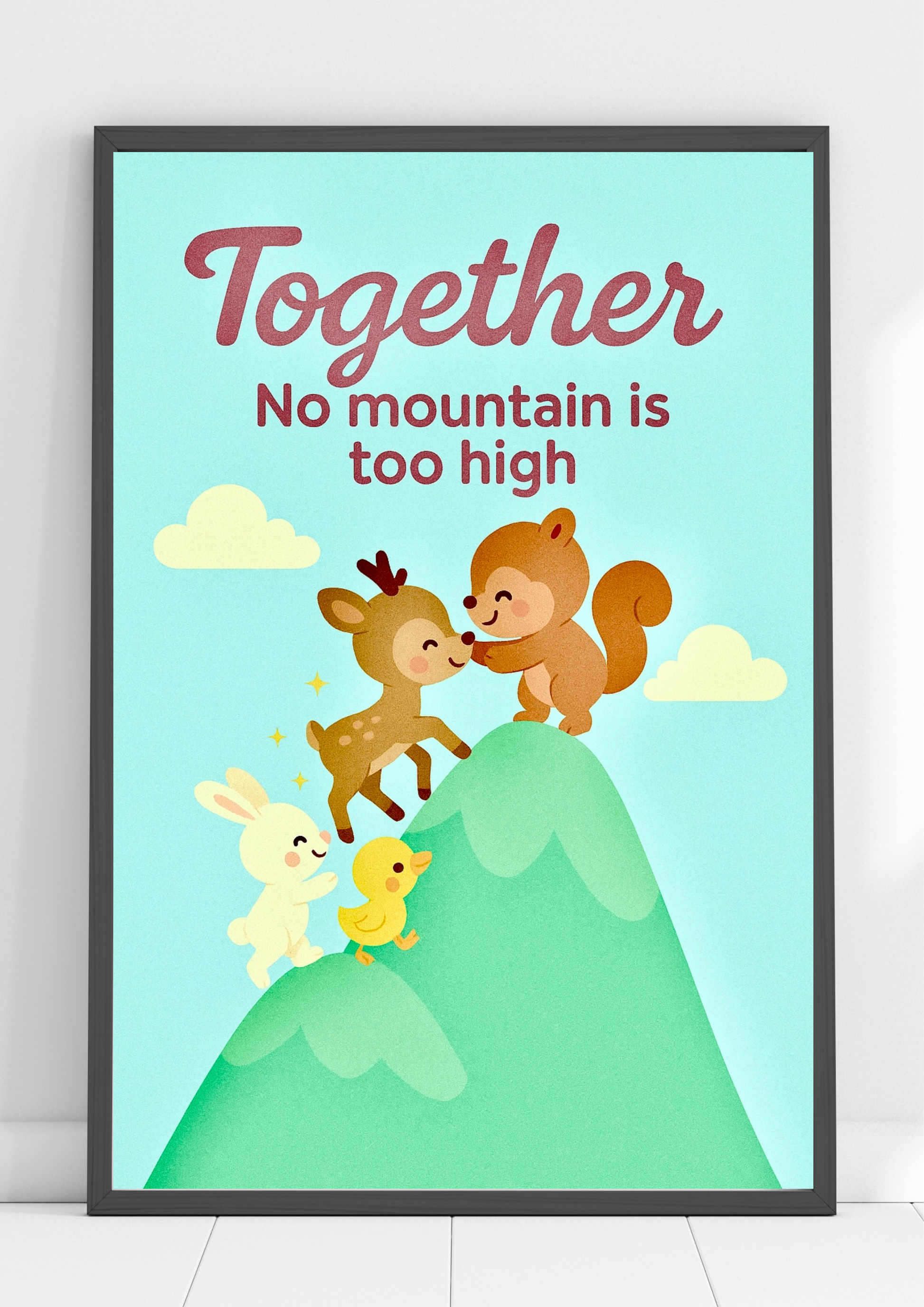 Celebrate your little one’s spirit of teamwork and courage with our Navratri inspired kids poster! Featuring adorable animals climbing a pastel mountain under the inspiring message “Together, No mountain is too high”, this artwork gently teaches toddlers the power of kindness, unity, and perseverance.